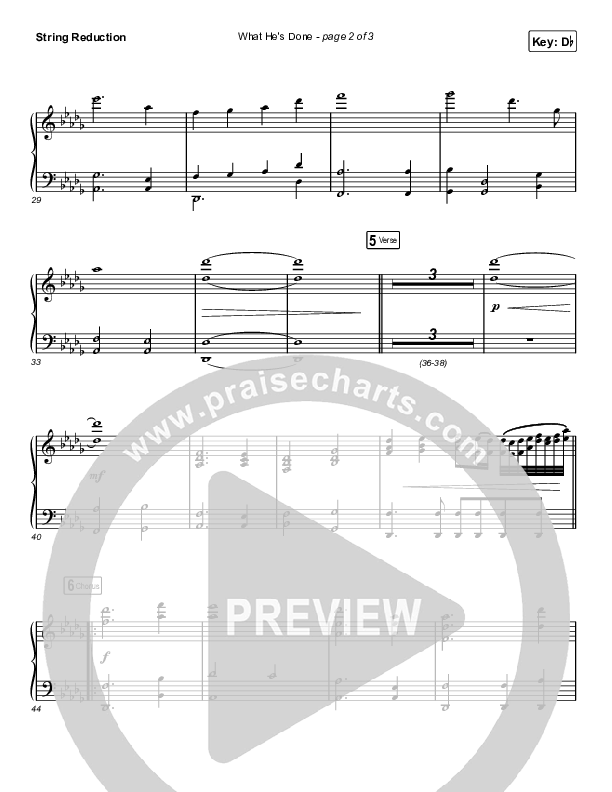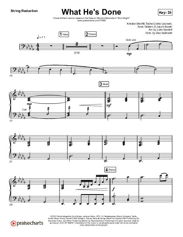 Download the String Reduction sheet music for What He's Done (Choral Anthem SATB) by Passion / Kristian Stanfill / Tasha Cobbs Leonard / Anna Golden / Arr. Luke Gambill, from the album Burn Bright (Studio EP). This song was arranged by Luke Gambill in the key of Db.