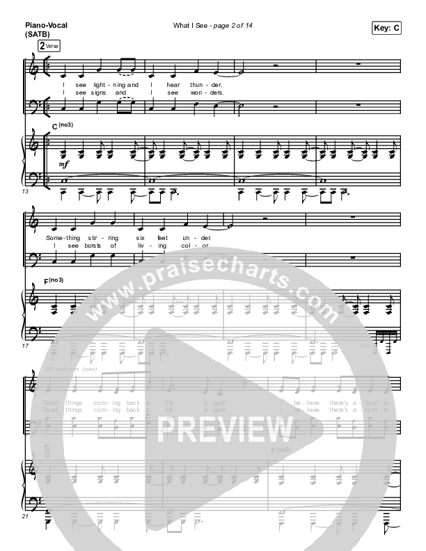 Download the sheet music for What I See by Elevation Worship / Chris Brown, from the album LION. This song was arranged by Grant Wall / Daniel Galbraith in the key of C, D, F.