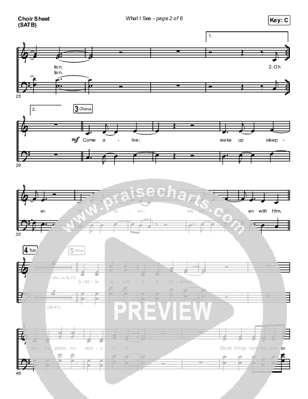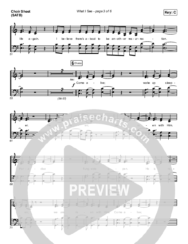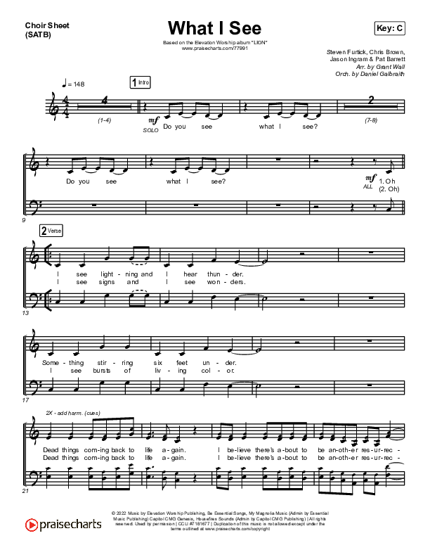 Download the Choir Sheet for What I See by Elevation Worship / Chris Brown, from the album LION. This song was arranged by Grant Wall / Daniel Galbraith in the key of C, D, F.