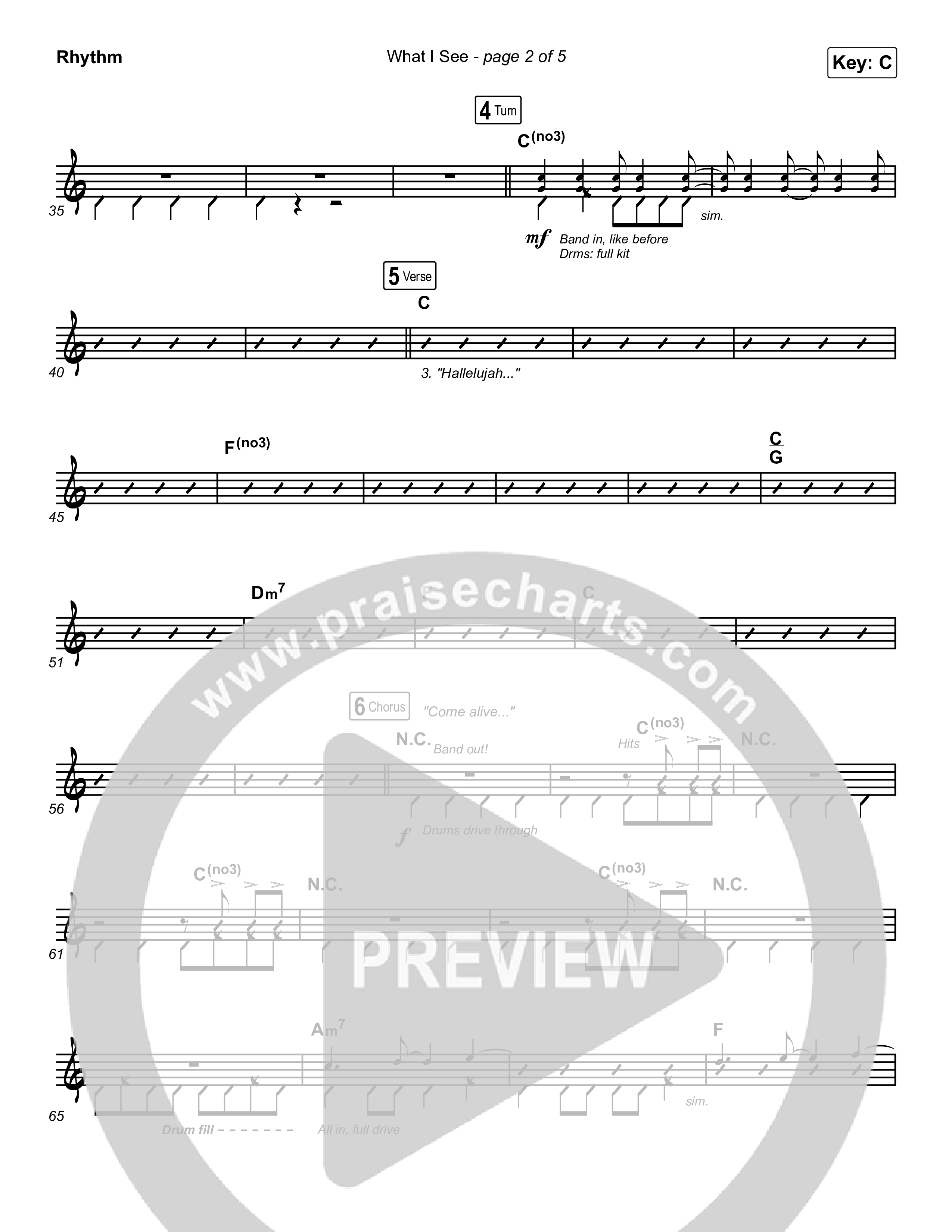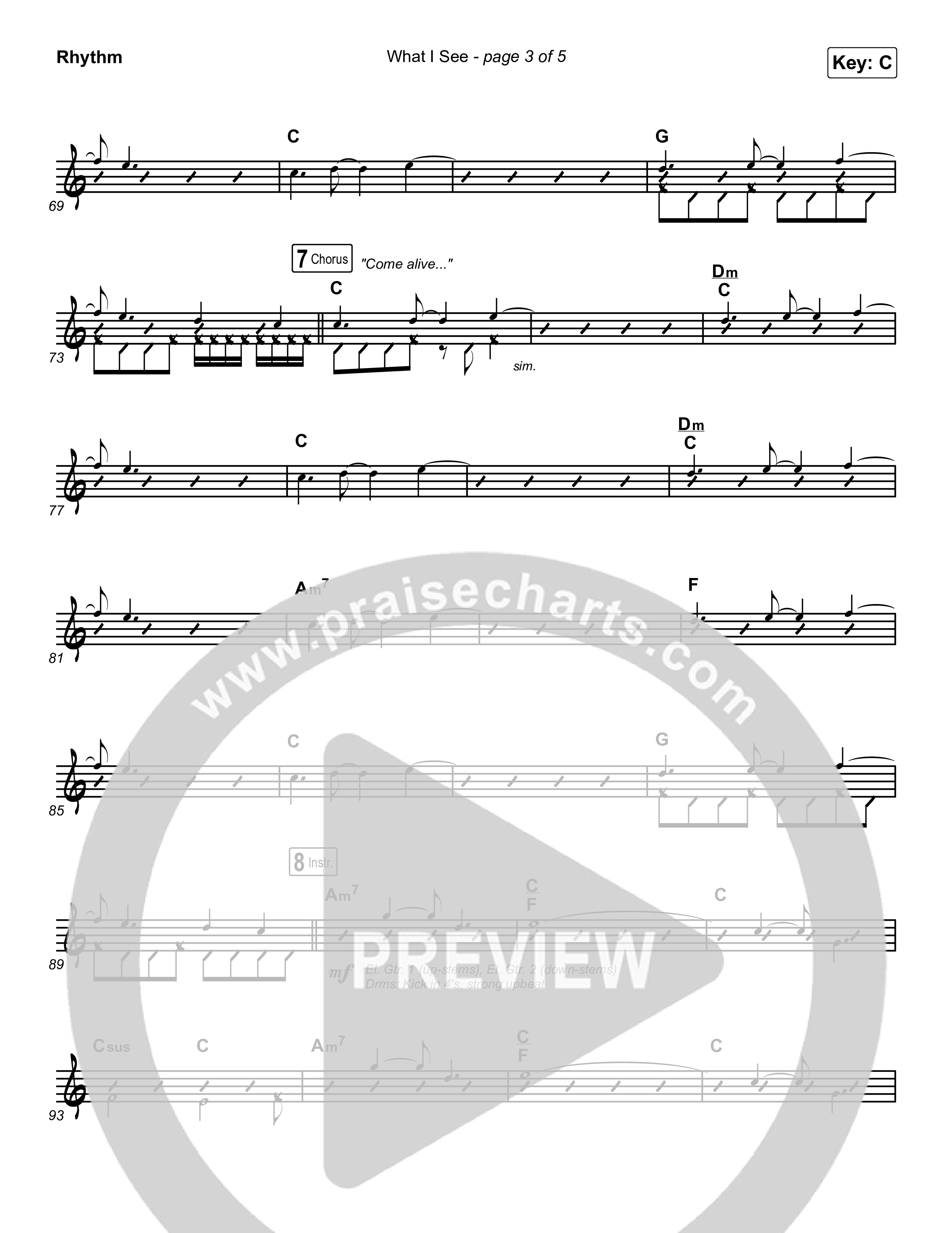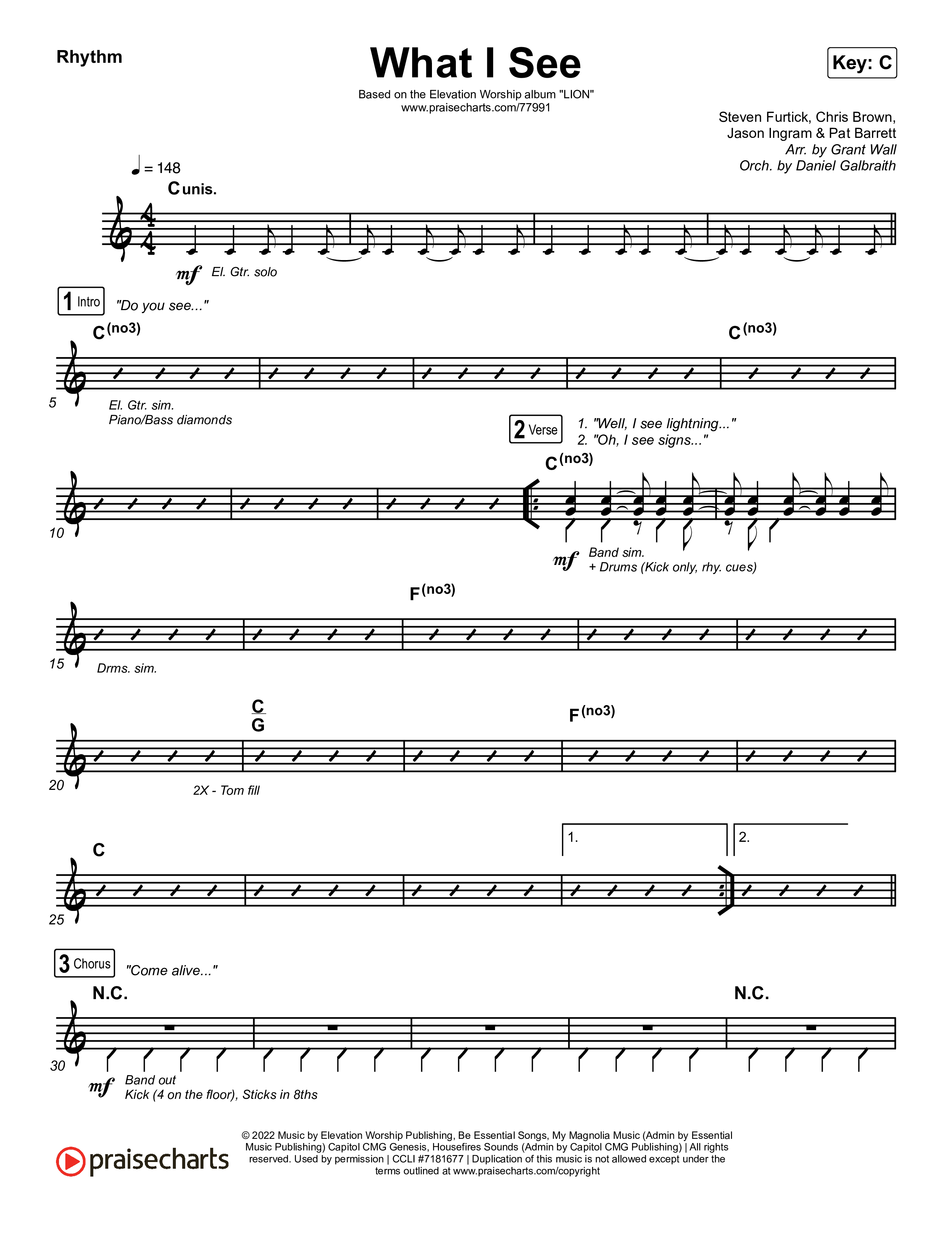 Download the Rhythm Chart for What I See by Elevation Worship / Chris Brown, from the album LION. This song was arranged by Grant Wall / Daniel Galbraith in the key of C, D, F.