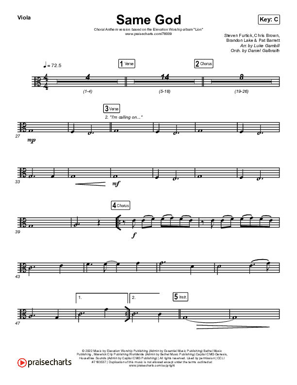 Download the Viola sheet music for Same God (Choral Anthem SATB) by Elevation Worship / Jonsal Barrientes / Arr. Luke Gambill, from the album Same God. This song was arranged by Luke Gambill in the key of C.