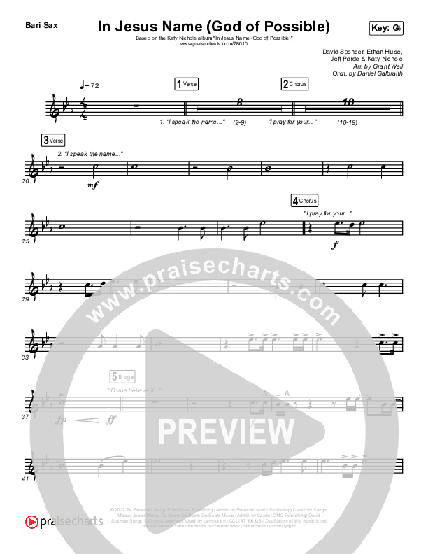 Download the Bari Sax sheet music for In Jesus Name (God Of Possible) by Katy Nichole, from the album Katy Nichole. This song was arranged by Grant Wall / Daniel Galbraith in the key of G, Gb.