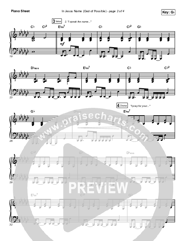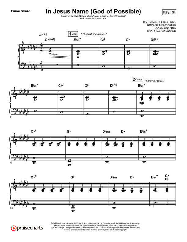 Download the piano sheet for In Jesus Name (God Of Possible) by Katy Nichole, from the album Katy Nichole. This song was arranged by Grant Wall / Daniel Galbraith in the key of G, Gb.