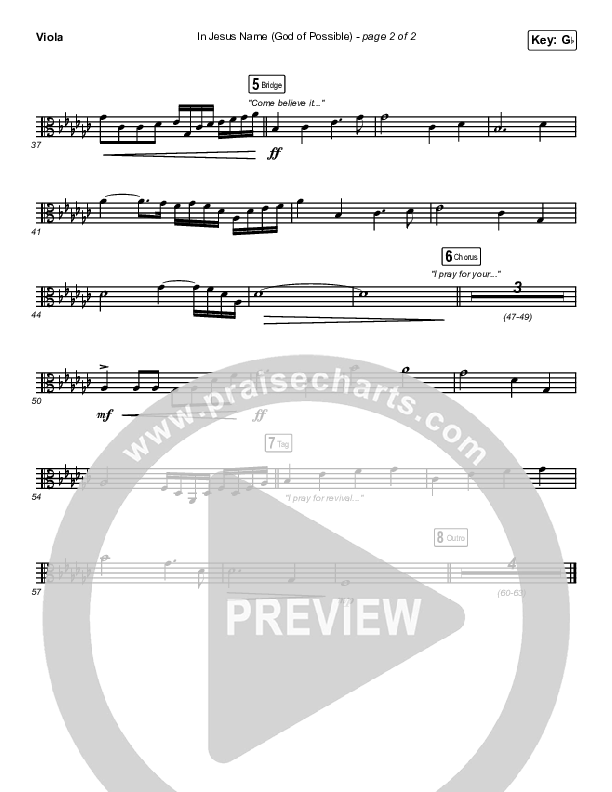 Download the Viola sheet music for In Jesus Name (God Of Possible) by Katy Nichole, from the album Katy Nichole. This song was arranged by Grant Wall / Daniel Galbraith in the key of G, Gb.