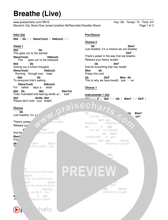 Download the PDF Chord Charts for Breathe (Live) by Maverick City Music / Doe Jones / Jonathan McReynolds / Chandler Moore, from the album Breathe. This song was arranged by Grant Wall in the key of C, Db.