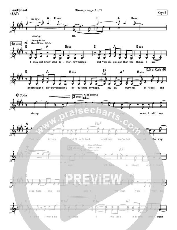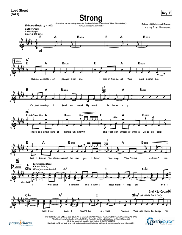 Download the sheet music for Strong by Pocket Full Of Rocks, from the album More Than Noise. This song was arranged by Brad Henderson in the key of E, F.
