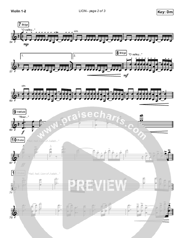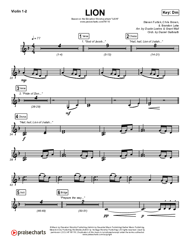Download the Violin sheet music for LION by Elevation Worship / Chris Brown / Brandon Lake, from the album LION. This song was arranged by Dustin Loehrs / Grant Wall / Daniel Galbraith in the key of Cm, Dm.