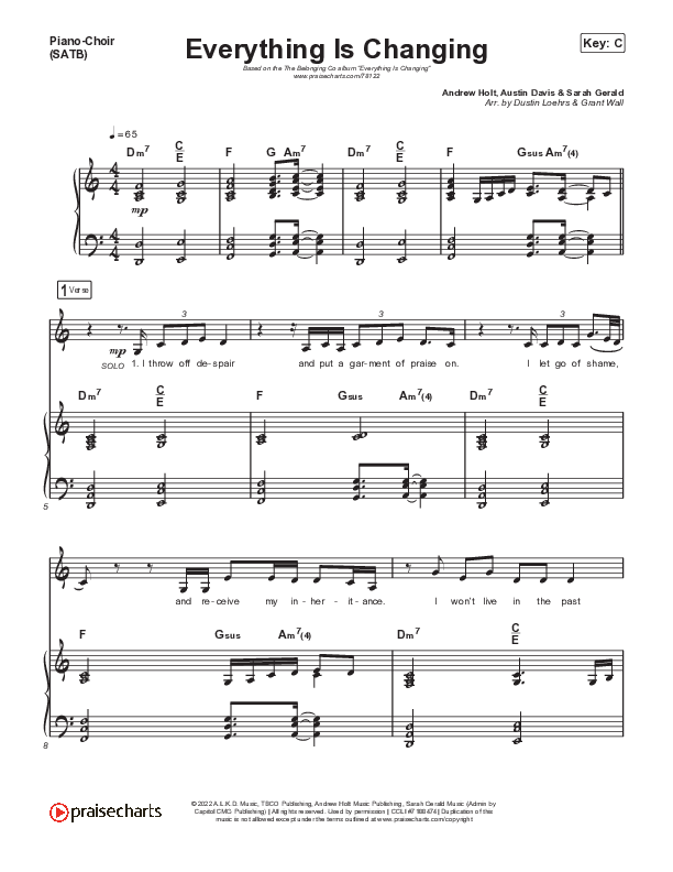 Download the sheet music for Everything Is Changing (Live) by The Belonging Co / Shantrice Laura, from the album Here. This song was arranged by Dustin Loehrs / Grant Wall in the key of C, D.