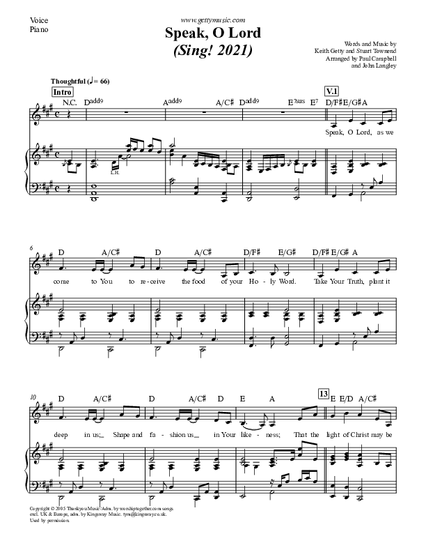 Download the sheet music for Speak O Lord by Laura Story / Keith & Kristyn Getty, from the album Sing! In Christ Alone - Live At The Getty Music Worship Conf. This song was arranged by Paul Campbell / John Langley in the key of A, Ab, C.
