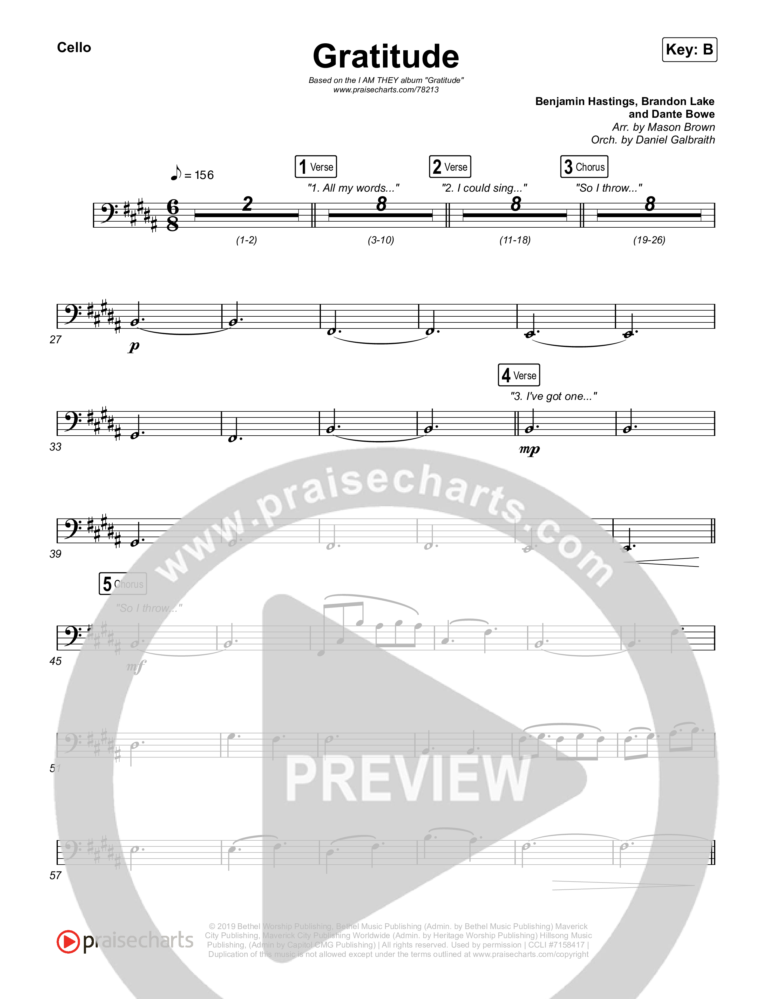 Download the Cello sheet music for Gratitude by I Am They / Cheyenne Mitchell, from the album Chapel Sessions. This song was arranged by Mason Brown / Daniel Galbraith in the key of A, B.