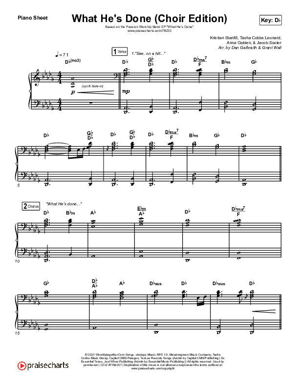 Download the piano sheet for What He's Done (Choir Edition) by Passion, from the album What He's Done EP. This song was arranged by Daniel Galbraith / Grant Wall in the key of C, Db.