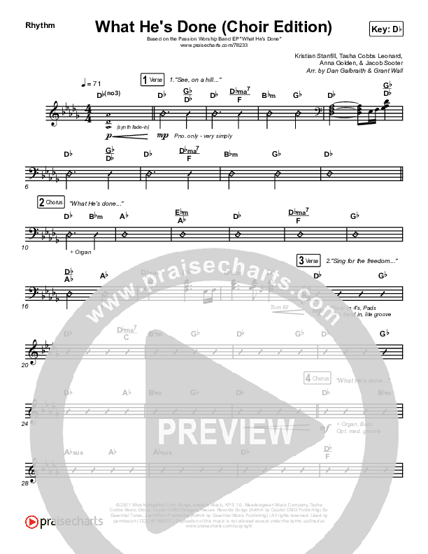 Download the PDF sheet music for What He's Done (Choir Edition) by Passion, from the album What He's Done EP. This song was arranged by Daniel Galbraith / Grant Wall in the key of C, Db.
