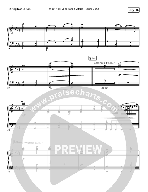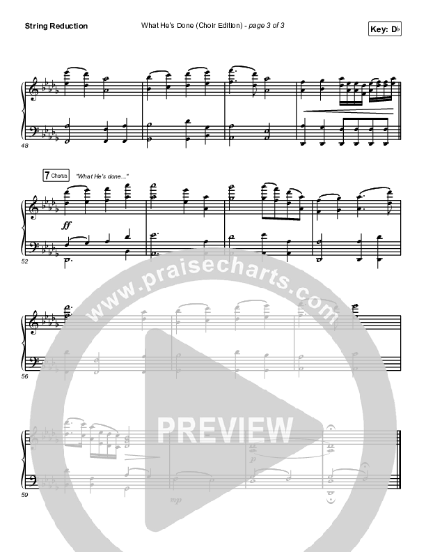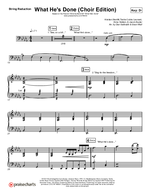 Download the String Reduction sheet music for What He's Done (Choir Edition) by Passion, from the album What He's Done EP. This song was arranged by Daniel Galbraith / Grant Wall in the key of C, Db.