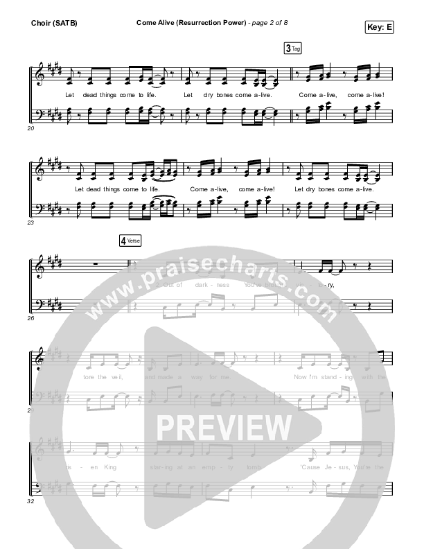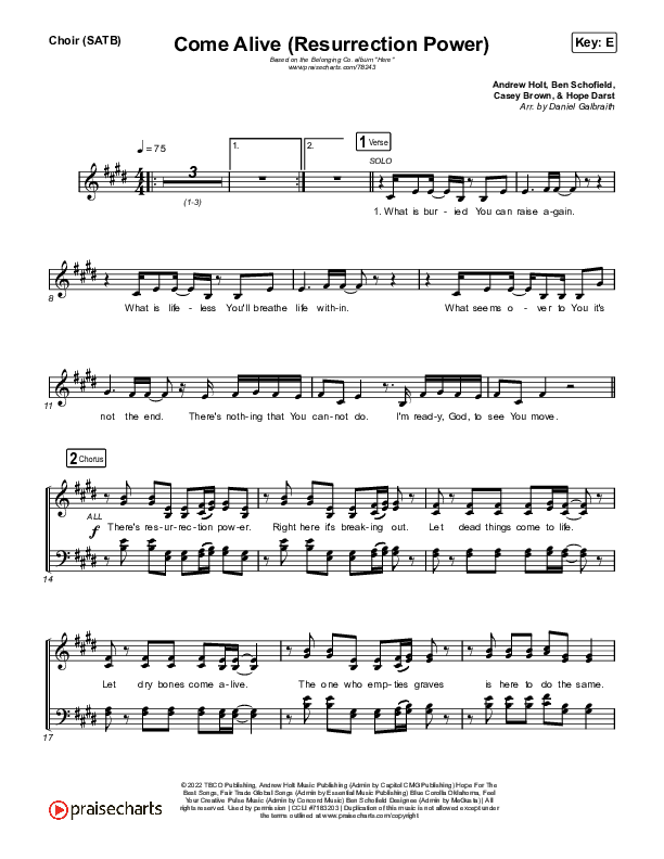 Download the Choir Sheet for Come Alive (Resurrection Power) (Live) by The Belonging Co / Hope Darst, from the album Here. This song was arranged by Daniel Galbraith in the key of E, Eb.