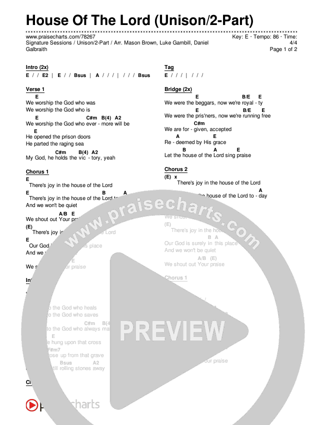 Download the PDF Chord Charts for House Of The Lord (Unison/2-Part Choir) by Signature Sessions / Arr. Mason Brown, from the album House Of The Lord (Signature Sessions). This song was arranged by Mason Brown in the key of E.