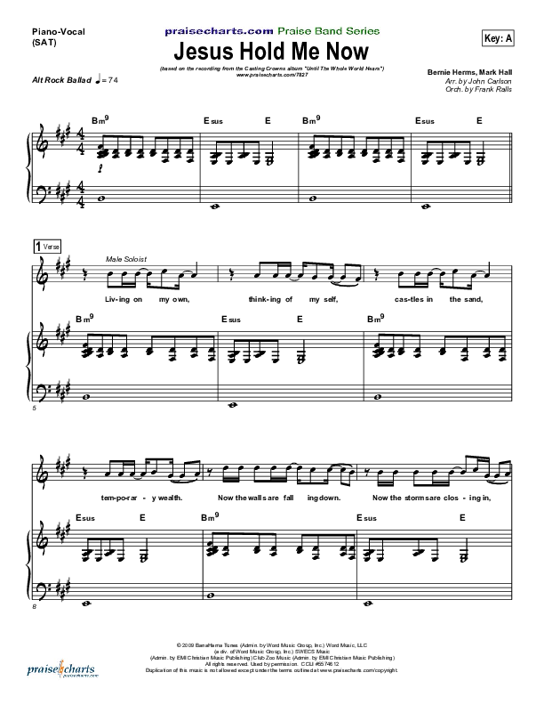 Download the sheet music for Jesus Hold Me Now by Casting Crowns, from the album Until The Whole World Hears. This song was arranged by Frank Ralls / John Carlson in the key of A, F.