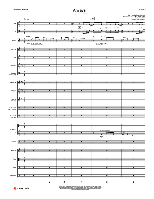 Download the Orchestration for Always by Chris Tomlin, from the album Always. This song was arranged by Grant Wall / Daniel Galbraith in the key of C, D, G.
