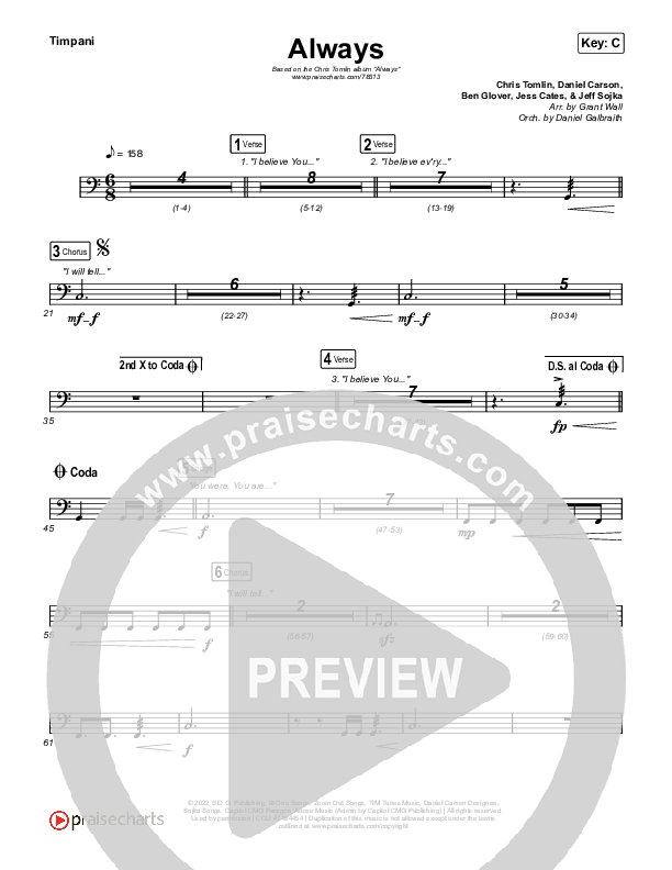 Download the Timpani sheet music for Always by Chris Tomlin, from the album Always. This song was arranged by Grant Wall / Daniel Galbraith in the key of C, D, G.