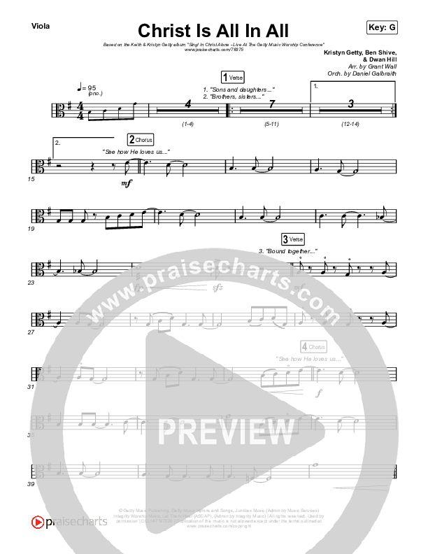Download the Orchestration string parts for Christ Is All In All (Live) by Keith & Kristyn Getty, from the album Sing! In Christ Alone - Live At The Getty Music Worship Conf. This song was arranged by Grant Wall / Daniel Galbraith in the key of Ab, G.