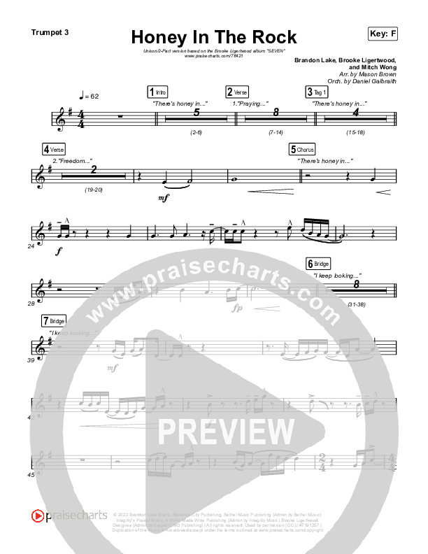 Download the Trumpet 3 sheet music for Honey In The Rock (Unison/2-Part Choir) by Brooke Ligertwood / Arr. Mason Brown, from the album SEVEN. This song was arranged by Mason Brown / Daniel Galbraith in the key of F.