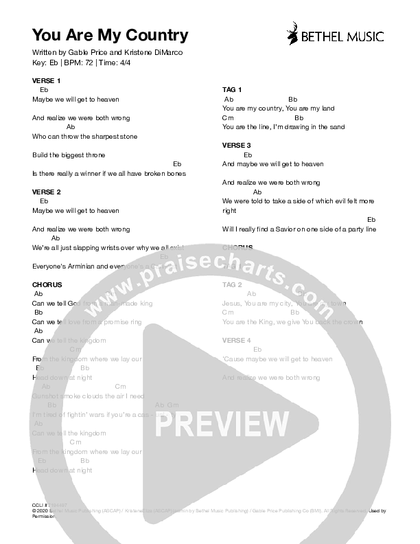 Download the PDF Chord Charts for You Are My Country by Kristene DiMarco, from the album The Field.