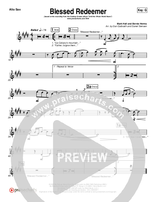 Download the AltoSax sheet music for Blessed Redeemer by Casting Crowns, from the album Until The Whole World Hears. This song was arranged by Daniel Galbraith / Daniel Semsen in the key of A, Ab, G.