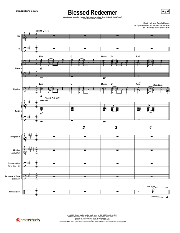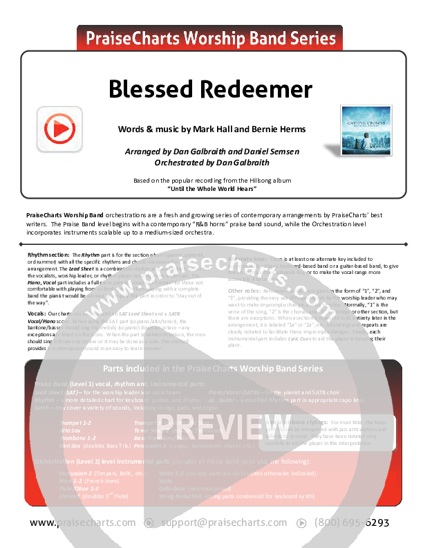 Download the Orchestration for Blessed Redeemer by Casting Crowns, from the album Until The Whole World Hears. This song was arranged by Daniel Galbraith / Daniel Semsen in the key of A, Ab, G.