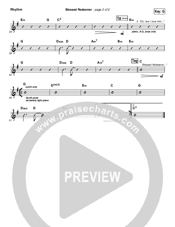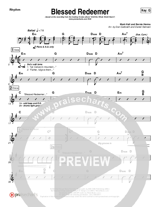 Download the Rhythm Chart for Blessed Redeemer by Casting Crowns, from the album Until The Whole World Hears. This song was arranged by Daniel Galbraith / Daniel Semsen in the key of A, Ab, G.