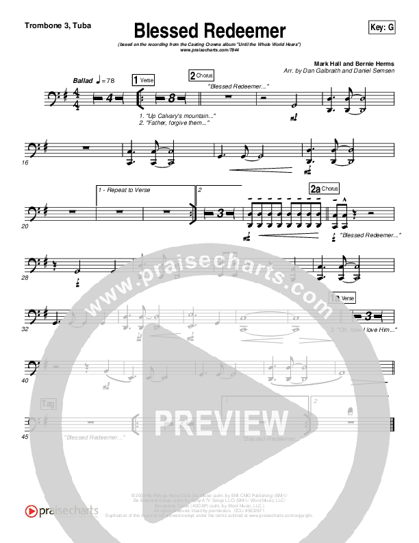 Download the Trombone 3/Tuba sheet music for Blessed Redeemer by Casting Crowns, from the album Until The Whole World Hears. This song was arranged by Daniel Galbraith / Daniel Semsen in the key of A, Ab, G.