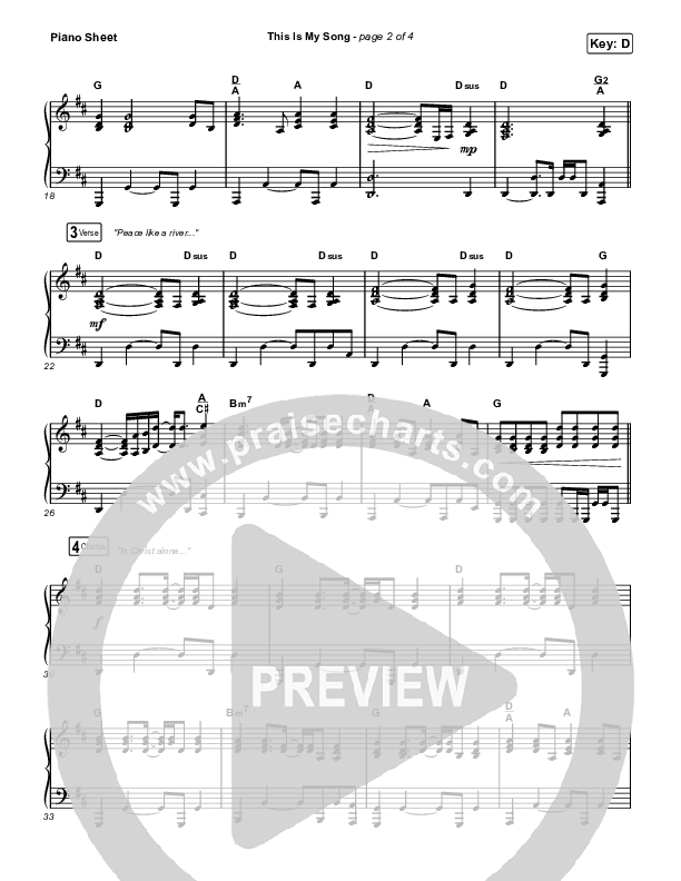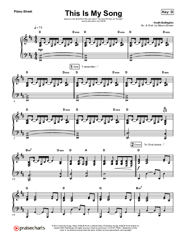 Download the piano sheet for This Is My Song (Live) by North Point Worship, from the album Our God Will See Us Through. This song was arranged by Mason Brown in the key of C, D.