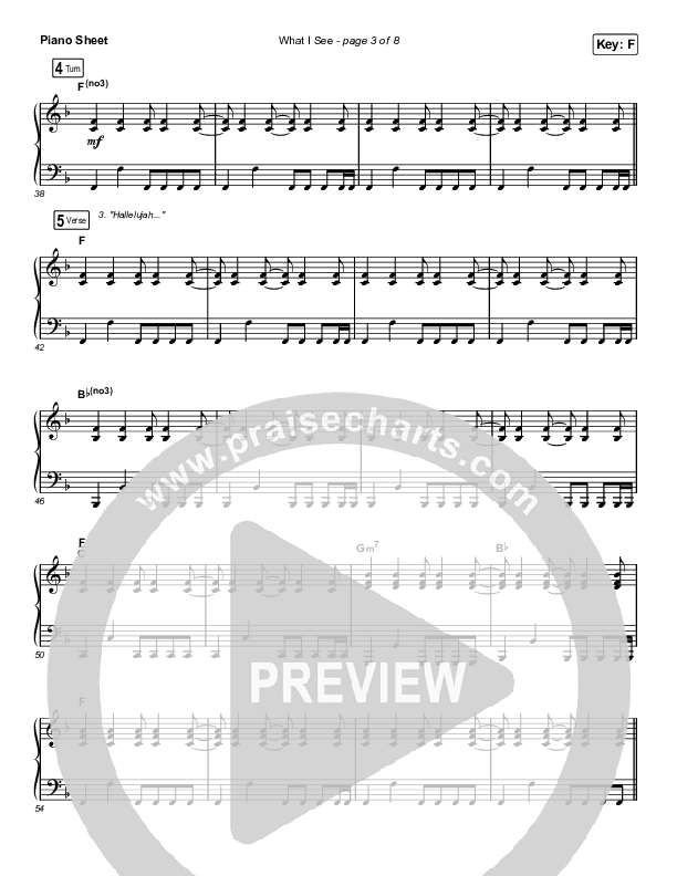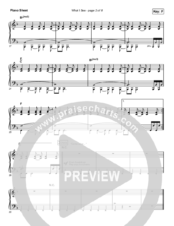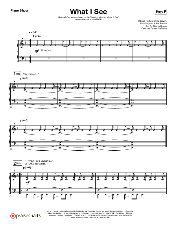 Download the piano sheet for What I See (Unison/2-Part Choir) by Elevation Worship / Chris Brown / Arr. Mason Brown, from the album LION. This song was arranged by Mason Brown / Daniel Galbraith / Grant Wall in the key of F.
