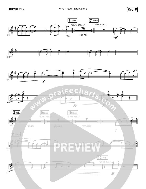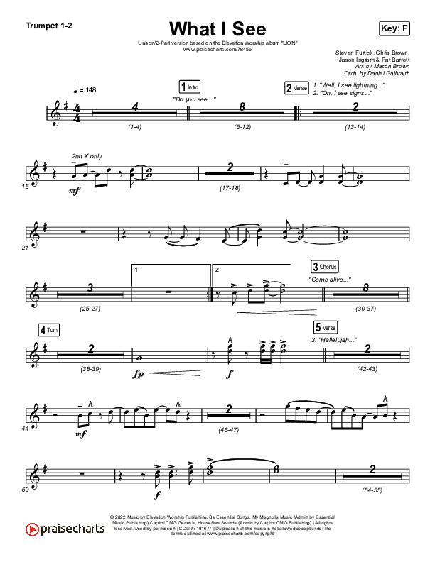 Download the trumpet sheet music for What I See (Unison/2-Part Choir) by Elevation Worship / Chris Brown / Arr. Mason Brown, from the album LION. This song was arranged by Mason Brown / Daniel Galbraith / Grant Wall in the key of F.