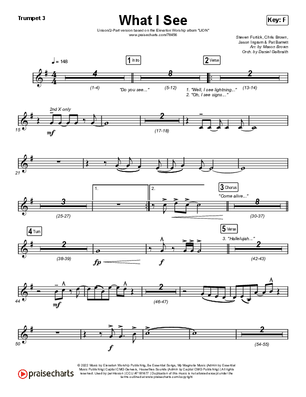 Download the Trumpet 3 sheet music for What I See (Unison/2-Part Choir) by Elevation Worship / Chris Brown / Arr. Mason Brown, from the album LION. This song was arranged by Mason Brown / Daniel Galbraith / Grant Wall in the key of F.