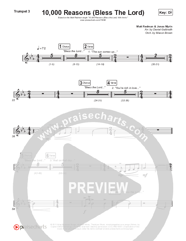 Download the Trumpet 3 sheet music for 10,000 Reasons (Bless The Lord) by Matt Redman / Bryan & Katie Torwalt / Pat Barrett / Naomi Raine / Crowder / Worship Together, from the album 10000 Reasons (Bless The Lord) [10th Anniversary]. This song was arranged by Daniel Galbraith / Orch. Mason Brown in the key of C, D, Db.