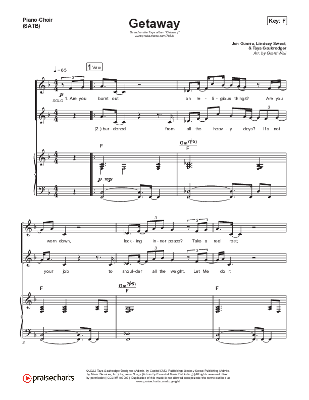 Download the PDF sheet music for Getaway by TAYA, from the album TAYA. This song was arranged by Grant Wall in the key of Eb, F.