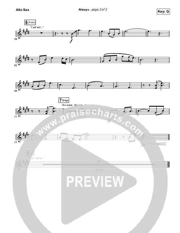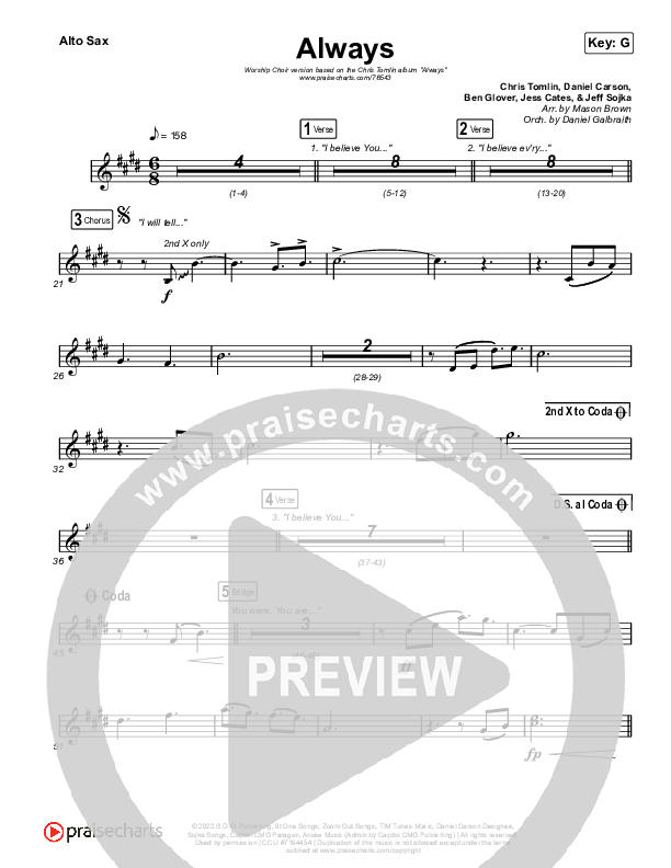 Download the AltoSax sheet music for Always (Worship Choir SAB) by Chris Tomlin / Arr. Mason Brown, from the album Always. This song was arranged by Mason Brown / Daniel Galbraith / Grant Wall in the key of G.