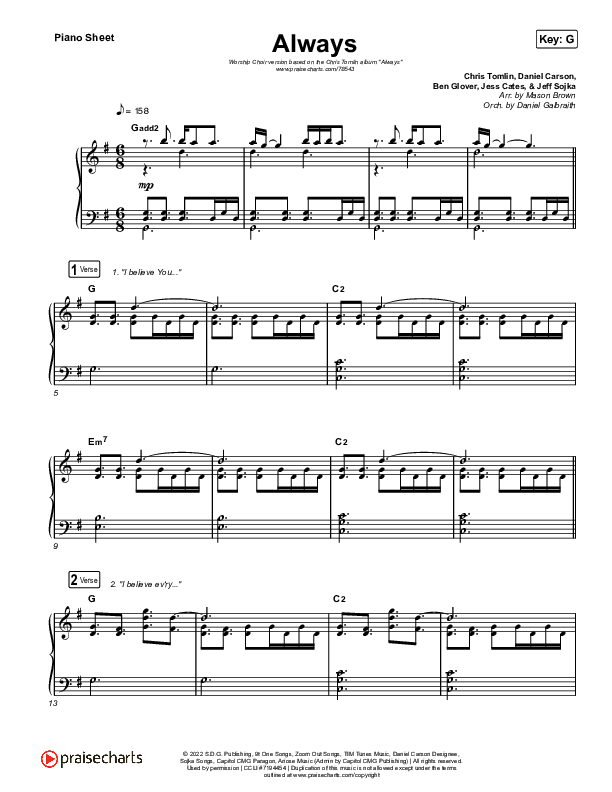 Download the piano sheet for Always (Worship Choir SAB) by Chris Tomlin / Arr. Mason Brown, from the album Always. This song was arranged by Mason Brown / Daniel Galbraith / Grant Wall in the key of G.