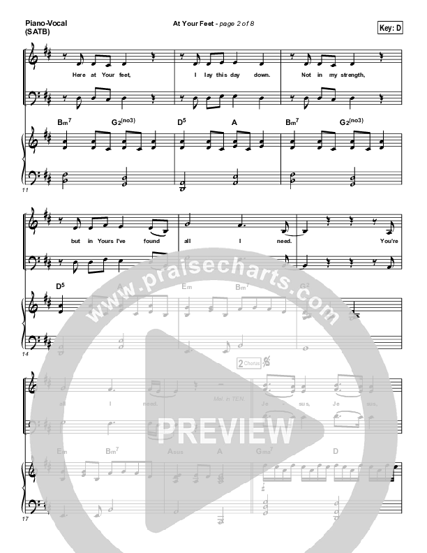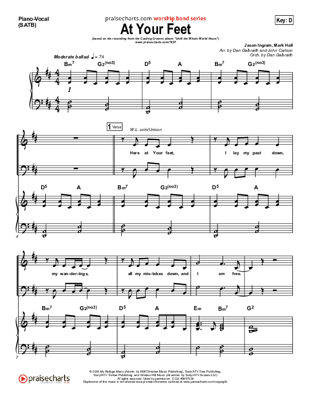 Download the sheet music for At Your Feet by Casting Crowns, from the album Until The Whole World Hears. This song was arranged by Daniel Galbraith / John Carlson in the key of D, E.