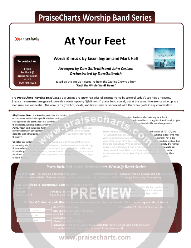 Download the Orchestration for At Your Feet by Casting Crowns, from the album Until The Whole World Hears. This song was arranged by Daniel Galbraith / John Carlson in the key of D, E.