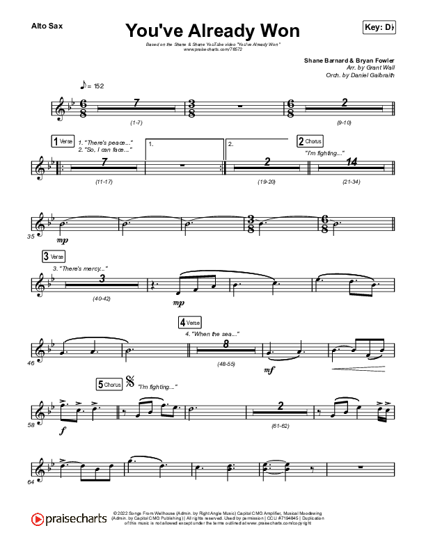 Download the AltoSax sheet music for You've Already Won (YouTube) by Shane & Shane, from the album You've Already Won: A Song For Ukraine. This song was arranged by Grant Wall / Daniel Galbraith in the key of D, Db.