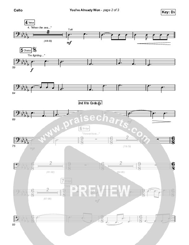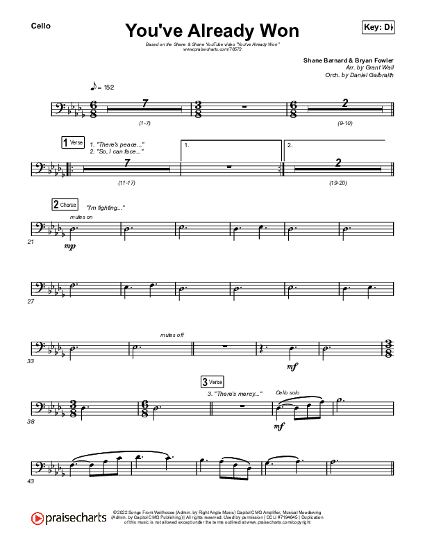 Download the Cello sheet music for You've Already Won (YouTube) by Shane & Shane, from the album You've Already Won: A Song For Ukraine. This song was arranged by Grant Wall / Daniel Galbraith in the key of D, Db.