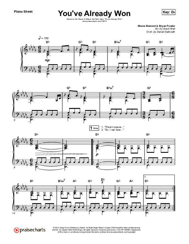 Download the piano sheet for You've Already Won (YouTube) by Shane & Shane, from the album You've Already Won: A Song For Ukraine. This song was arranged by Grant Wall / Daniel Galbraith in the key of D, Db.