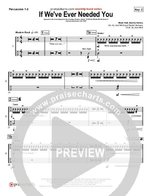 Download the Orchestration for If We've Ever Needed You by Casting Crowns, from the album Until The Whole World Hears. This song was arranged by Joel Mott / Daniel Semsen in the key of C, D.