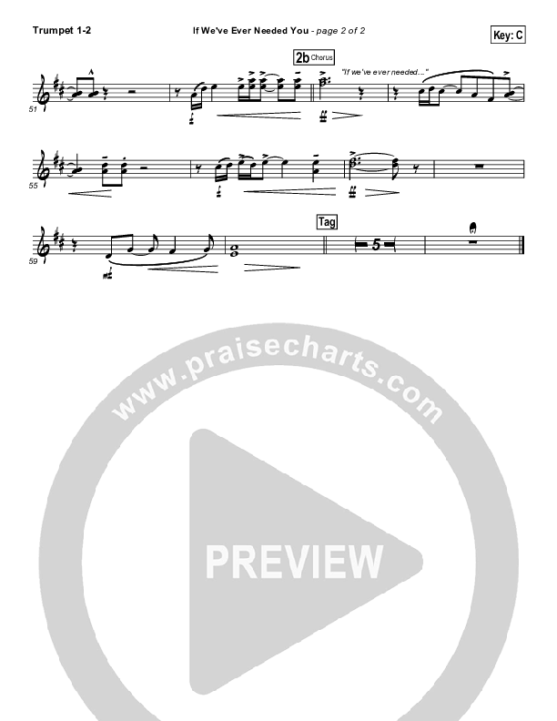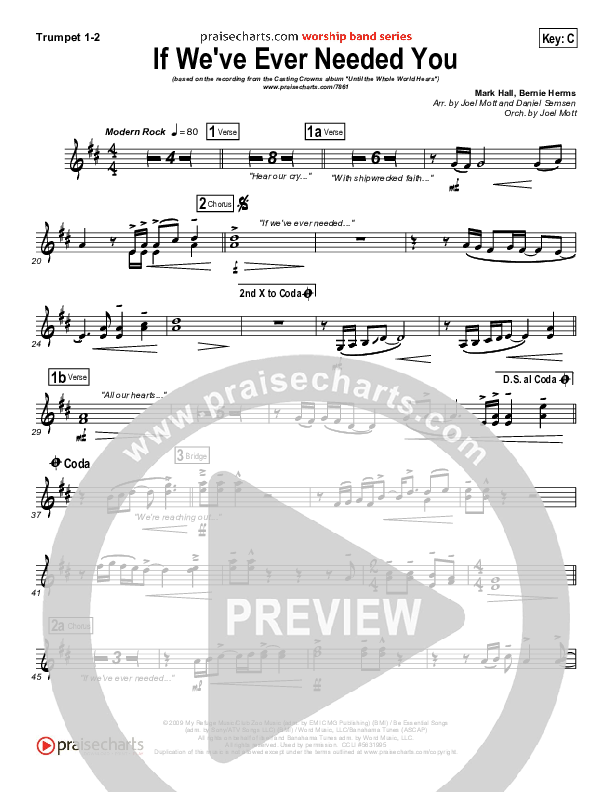 Download the trumpet sheet music for If We've Ever Needed You by Casting Crowns, from the album Until The Whole World Hears. This song was arranged by Joel Mott / Daniel Semsen in the key of C, D.