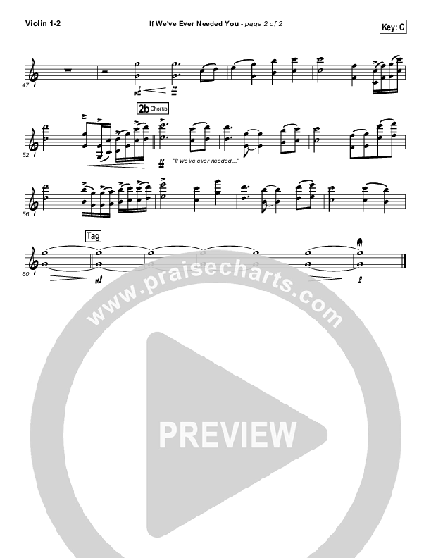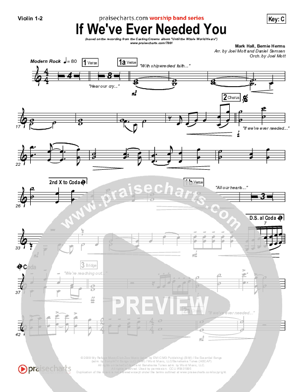 Download the Violin sheet music for If We've Ever Needed You by Casting Crowns, from the album Until The Whole World Hears. This song was arranged by Joel Mott / Daniel Semsen in the key of C, D.