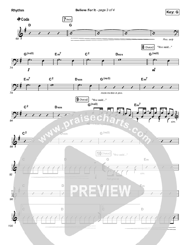 Download the Rhythm Chart for Believe For It (Unison/2-Part Choir) by CeCe Winans / Arr. Erik Foster, from the album Believe For It (Deluxe). This song was arranged by Erik Foster / Luke Gambill / Daniel Galbraith in the key of G.