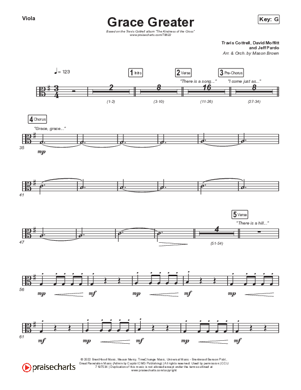 Download the Viola sheet music for Grace Greater by Travis Cottrell, from the album The Kindness Of The Cross. This song was arranged by Mason Brown in the key of G.
