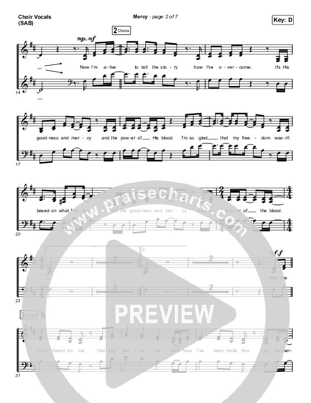 Download the PDF sheet music for Mercy (Worship Choir SAB) by Maverick City Music / Elevation Worship / Arr. Erik Foster, from the album Old Church Basement. This song was arranged by Erik Foster / Luke Gambill / Daniel Galbraith in the key of D.