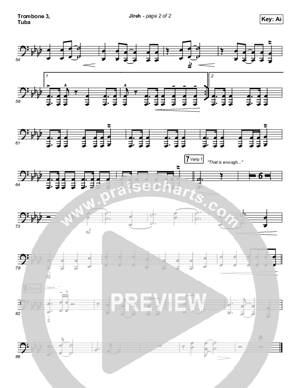 Download the Trombone 3/Tuba sheet music for Jireh (Unison/2-Part Choir) by Maverick City Music / Elevation Worship / Arr. Mason Brown, from the album Old Church Basement. This song was arranged by Mason Brown / Luke Gambill / Daniel Galbraith in the key of Ab.