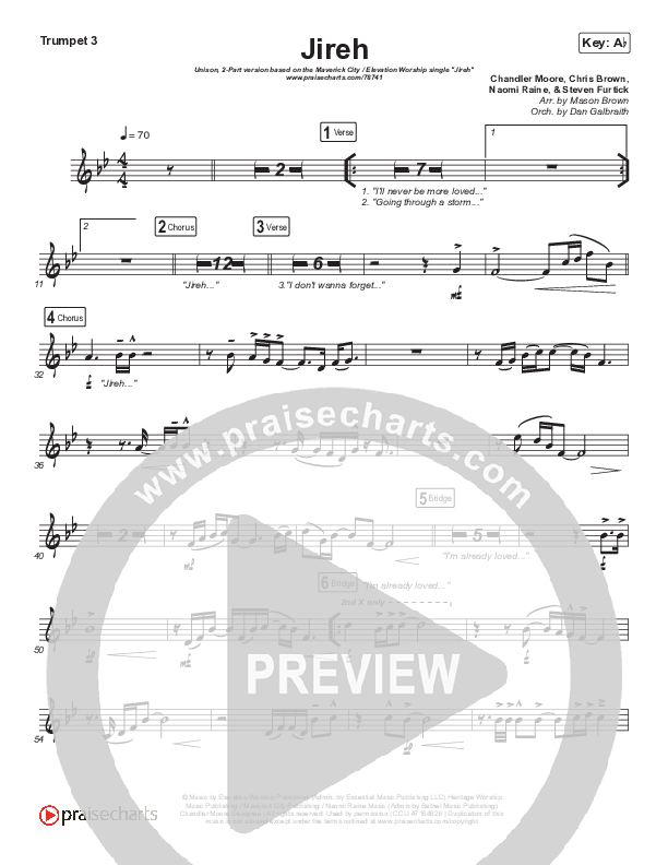 Download the Trumpet 3 sheet music for Jireh (Unison/2-Part Choir) by Maverick City Music / Elevation Worship / Arr. Mason Brown, from the album Old Church Basement. This song was arranged by Mason Brown / Luke Gambill / Daniel Galbraith in the key of Ab.